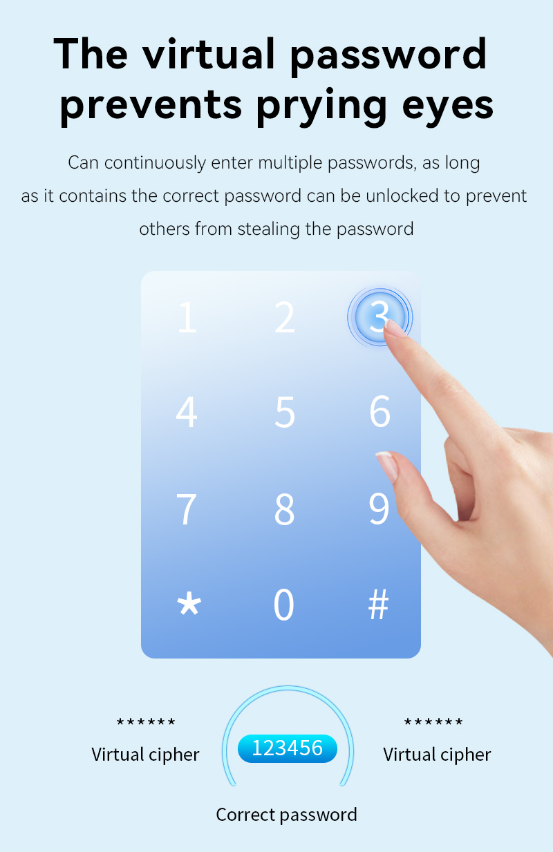 Ø Meerdere ontgrendelingsmethoden: uitgerust met vingerafdrukherkenning, wachtwoord invoeren, toegang tot de kaartsleutel, telefoon APP-besturing en een traditionele sleutel voor back-up.